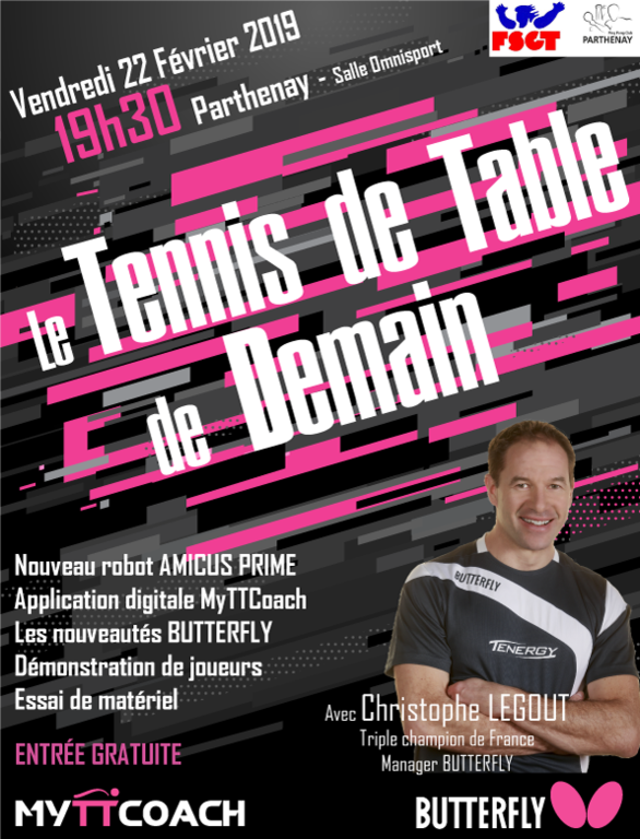 Nous avons une nouveauté le vendredi soir 22 février , la présence du concepteur de l’application MY TT COACH et du triple champion de FRANCE FFTT Chistophe LEGOULT Tous les joueurs du club, les pongiste départementaux et régionaux, toutes les délégations déjà arrivées sur PARTHENAY sont invitées à participer à cet évènement exceptionnel qui clôturera par une démonstration et séance autographes ....